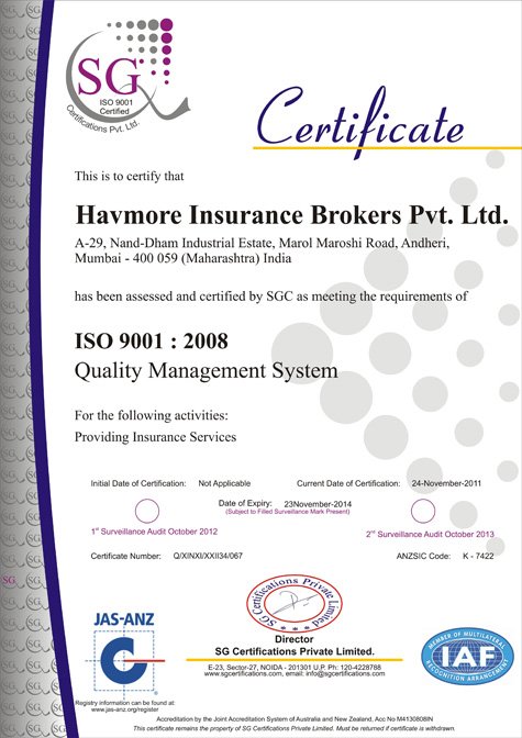 We are one of the elite members in insurance brokers’ club who are ISO 9001:2008 certified. It highlights our robust quality service delivery systems, orientation towards continual improvement and customer satisfaction. Our expertise and experience in the field of insurance, coupled with obsession for finest service to the clients, insures complete contentment for all the stakeholders.